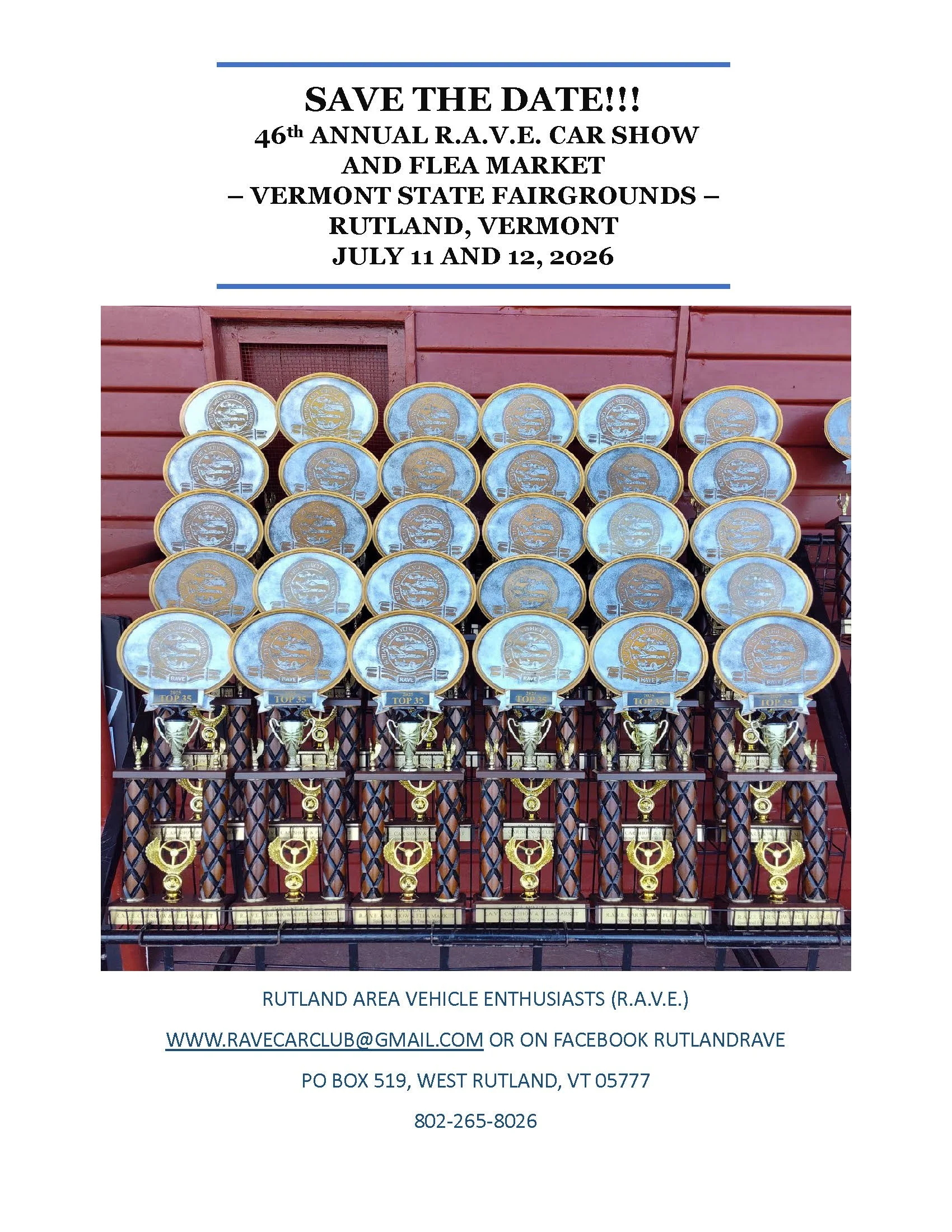 For 2025, we will be celebrating our 45th Annual car show, known as the R.A.V.E. Car Show and Flea Market as well as a large craft vendor area, on July 12th and 13th, at the Vermont State Fairgrounds in Rutland, VT.